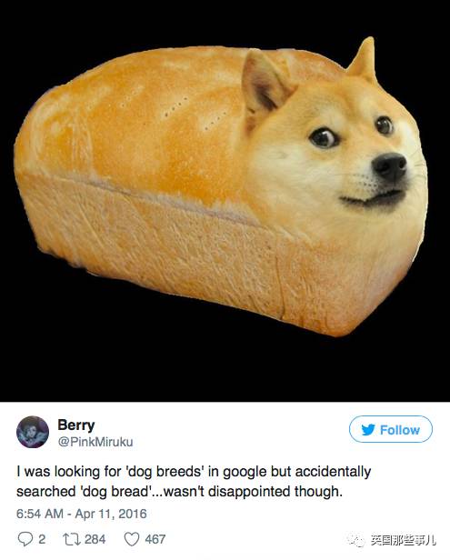 网友8:我在查 “dog breeds”(狗种类),错打成了 “dog bread”(狗面包)......嗯...... 长姿势了......