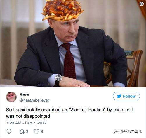 网友9:我是把普京大帝的大名Putin不小心输成了 “Poutine(沾奶酪西红柿的薯条)” …………