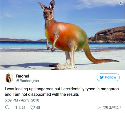 网友7:我在网上搜 “袋鼠”,但是把 “kangaroos”(袋鼠) 拼成了 “Mangaroo”(芒果鼠?),这都行?.....