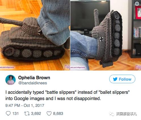 网友1:我不小心在google图片的搜索栏里把 “ballet slippers”(芭蕾舞鞋)打成了 “battle slippers”(战斗拖鞋),结果并没有让我失望