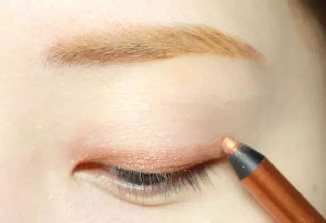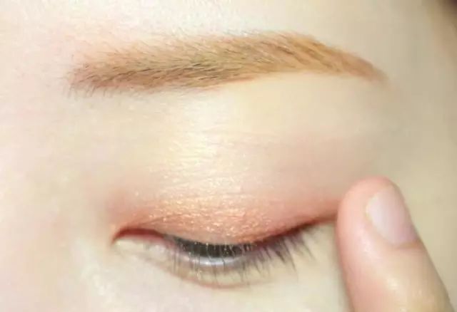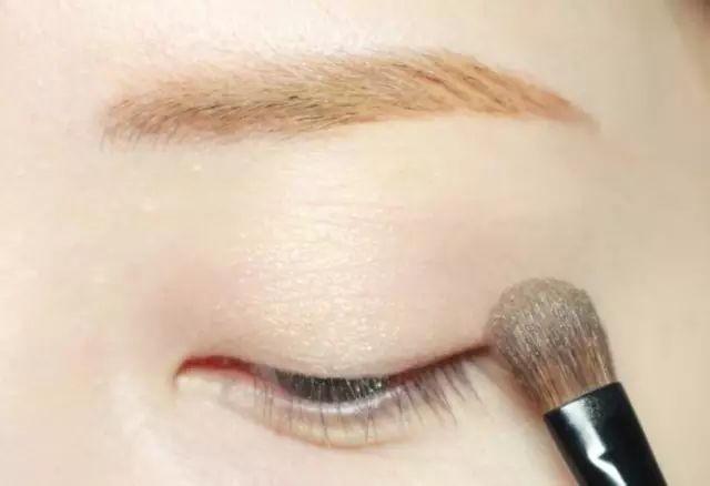 STEP2:玫瑰棕的眼影笔在双眼皮内侧晕染一层。