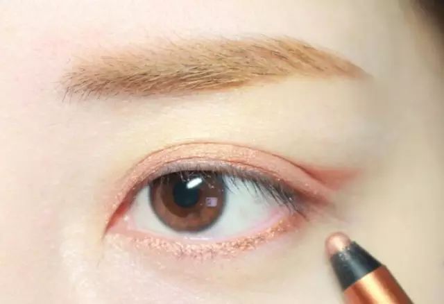 STEP4:用玫瑰金的眼影用画眼线的形式从下眼睑的眼头向眼尾晕染直至画至上眼尾的末端。