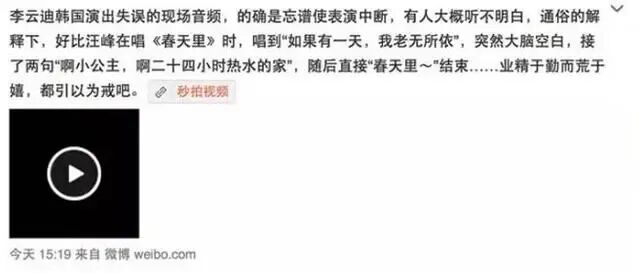 2015年。李云迪在韩国首尔作为客座钢琴在演奏《肖邦第一协奏曲》第一乐章时发生失误,突然忘记要弹什么,演奏被迫突然中断和停止。