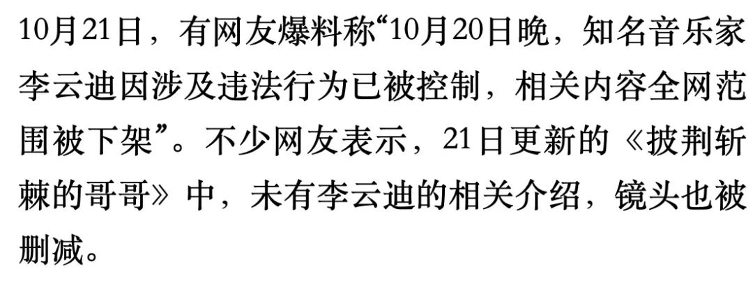 随后,有网友爆料,最新一期的《披荆斩棘的哥哥》节目中,李云迪镜头被剪,名字也被消音处理,相关内容已经全部下架。