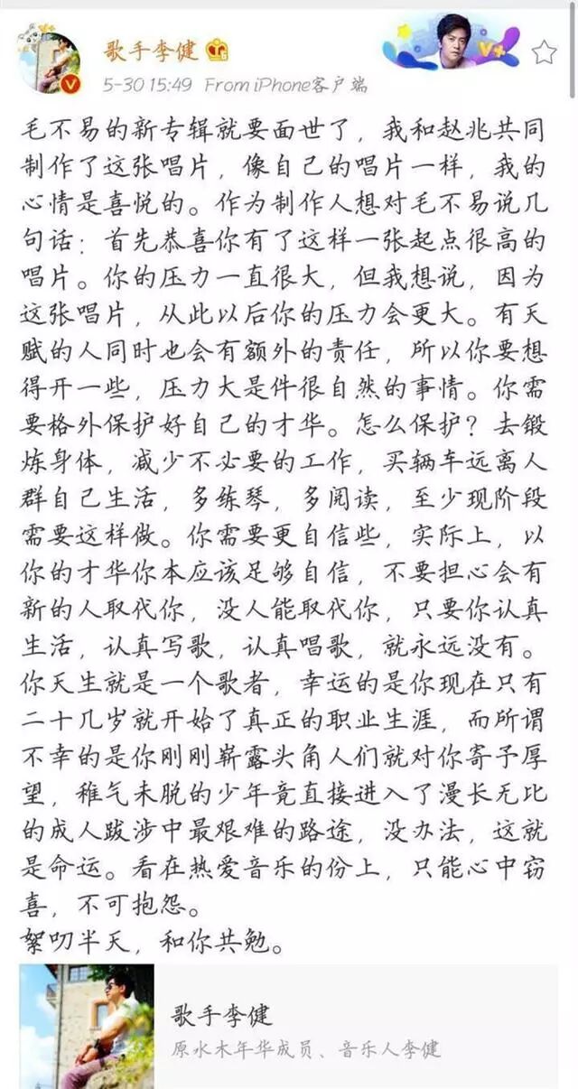 刘锦泽在微博中也曾透露过对李健的感动,李健为广大原创歌手所做的努力,值得每一个热爱音乐的人肯定。