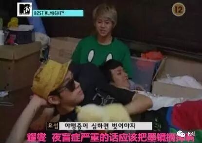 呃,来看看梁耀燮的无情拆台:夜盲症不是晚上看不见吗?严重的话应该把墨镜摘掉啊。