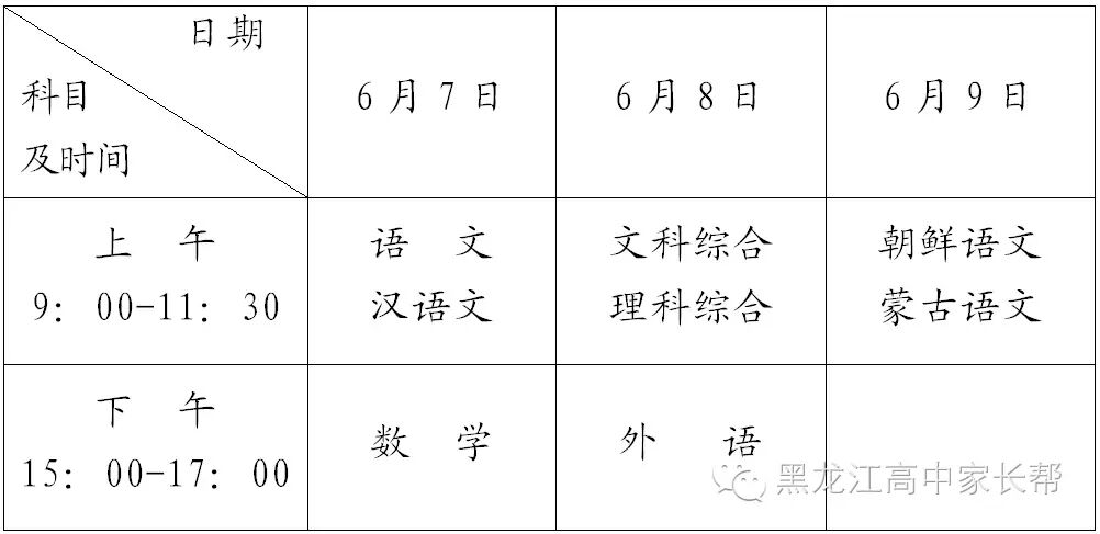 根据《2016年黑龙江省普通高等学校招生全国统一考试考务工作规定》,今年高考时间已确定为:6月7日~9日。请各学校和广大考生按考试日程做好相关安排。