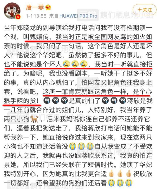 蒋欣,好惨一女的... 娱乐扒姬 内地女星 2020-01-02 22:00:37 1437 创作不易,用心坚持,欢迎请BaGua喝几杯爱心咖啡!打赏并支持本文 打赏并删除本文 唐一菲凌潇肃这两口子最近挺活跃的,尤其是唐一菲女士。2019年12月19日,唐一菲女士一开微博,就玩了一出旧事重提,主动撕上了姚晨女士。于是网络上关于姚晨唐一菲凌潇肃,当年到底谁对谁错又轰轰烈烈吵了一波。8姬当时没写,是觉得这瓜都过去快十年了,早成烂瓜了......姚晨出轨了吗?出了。凌潇肃出轨了吗?出了。唐一菲是小三吗?是。全员恶人。没有涛的必要。但......唐一菲女士实在太能作妖了。昨儿,她在微博又跟蒋欣较上劲了。文很长。先来跟大家梳理下。唐女士在这篇微博里主要说了两件事儿。第一件事儿,是蒋欣曾经是她姐们,若干年前,她妈不让她养狗,于是她把她养的两只小狗送到了蒋欣家里。文章中,唐女士两度提到,希望她的狗在若干年后的今天还活着。这就让吃瓜群众很是疑惑,你把狗放姐妹家里寄养,这么多年不闻不问,现在来微博问人家你的狗是不是还活着......这到底是真爱自己家的狗狗呢,还是想借着红了之后的蒋欣炒作自己呢。第二件事,唐女士提到了蒋欣在《甄嬛传》里演的华妃一角。说当年郑晓龙的副导演曾给她打电话问她有没有档期演《甄嬛传》的华妃,但鉴于她当时正被全国网友痛骂,所以她就问了这个华妃是不是好人。在得知华妃干了挺多不好的事儿后,她拒绝了。因为她怕网友把角色往她身上套,怕网友说“看吧,这唐一菲肯定就跟这角色一样,是个心狠手辣的货”。这话讲的好似是华妃这个角色是她唐一菲不要的,才轮到蒋欣的。有点蒋欣捡了她漏,才得以大火的味道在......而明眼人都知道,演员跟角色其实是相互成就的,若演员演技渣,角色人设再好,也爆不了。华妃这个角色能如此深入人心,既可恨又可怜,一定意义上是蒋欣成就的。唐女士在这么多年后的今天在微博公然cue蒋欣的华妃,这就让吃瓜群众开始替唐女士的昔日姐妹蒋欣鸣不平了。不过,唐女士这条微博虽然明面上在cue蒋欣,但实际上,是在控诉姚晨女士。又是心狠手辣,又是被全国人民骂的。唐女士是想在新年第一天卖卖惨,想让全国人民帮她去骂骂姚晨女士......她还陷在当年那场N角游戏里,不可自拔。不过,暂且不说,她的的确确是小三,被骂也并大冤,就说她因为被全国人民骂怕了,于是拒绝了演坏女人华妃,也是站不住脚的。因为《甄嬛传》是2010年年底开机的,选角只能更早。而姚晨是2011年年初提的离婚,唐女士因为当小三被骂,也是在这之后。既然如此,也就不存在,唐女士因为当小三被全国人民骂,从而放弃华妃这个角色了。这个因果关系并不成立。于是,被吃瓜群众发现撒谎了的唐女士在2020年新年第一天,喜获翻车,被愤怒的吃瓜群众喷到删博。当然,惨还是蒋欣惨。当年好心收留了所谓姐妹的狗狗,没想到好心没好报。若干年后的现在,居然成了姐妹跟人前原配撕逼炒作的工具。无端惹了一身骚。简直巨冤!而对于唐一菲8姬真的无话可说了,没见过重新抓了一手好牌,又打得稀巴烂的。本来姚女士这些年因为恶之花,以及出轨纠纷,帮她重新拉回了不少好感值。现在好了,又败光了......唐女士81年生人,03年进入娱乐圈。因为颜值不错 创作不易,用心坚持,欢迎请BaGua喝几杯爱心咖啡!打赏并支持本文 打赏并删除本文 感谢您的支持鼓励,我会继续努力的!文章地址:用户邮箱:打赏金额:USDT 请输入数字点击”去打赏“,即可进行打赏支持本文章哦 蒋欣 About the Author 娱乐扒姬 功能介绍:扒点不一样。 Related Posts 关晓彤素颜震惊全网,终于明白她为什么要把 2020-01-19 23:18:08 蒋欣,好惨一女的... 2020-01-02 22:00:37 被张馨予骂荡妇淫娃,她今天退圈了 2019-12-24 22:00:23 蒋劲夫,又闹着要杀人了! 2019-11-28 22:00:49 范冰冰又双叒叕复出失败?别作妖了好吗 2019-09-28 22:58:30 发表评论