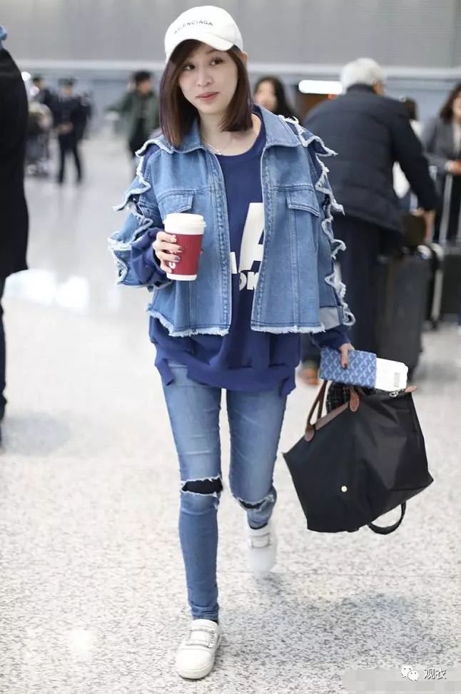 接下来我们来看看王心凌在机场上时候其他的款式搭配,身穿一件蓝色的条纹衬衫搭配一条黑色的破洞牛仔裤,这一身衬衫配牛仔还蛮时髦的呢,脚踩着一双蓝色的休闲鞋,肩上背着一款黑色的包包,在造型上戴着一顶黑色的鸭舌帽很帅气呢,这一身单品的搭配款式尽显活力少女的气息,时尚感爆棚!