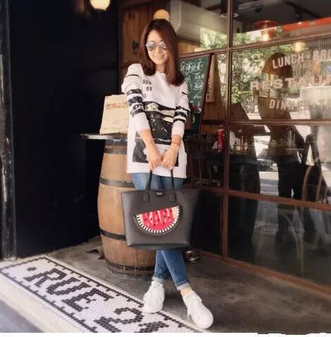 Tips:适当地卷起袖口时髦法我们都知道,像钟小姐这样一边放下一边卷起的随意感更是时髦得没边儿了,左图这种清新的横条纹T很适合平胸妹哦