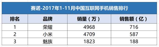 (权威机构赛诺的数据显示,荣耀1-11月销量与销售额均是中国互联网手机第一)