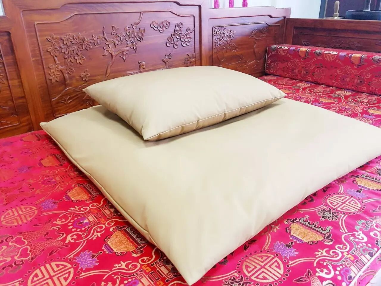 “佛医打坐垫”是参照南怀瑾老师的设计,用三种不同种类的棉,以科学比例混合填充,所制成的完全符合人体力学的专业禅修打坐垫。