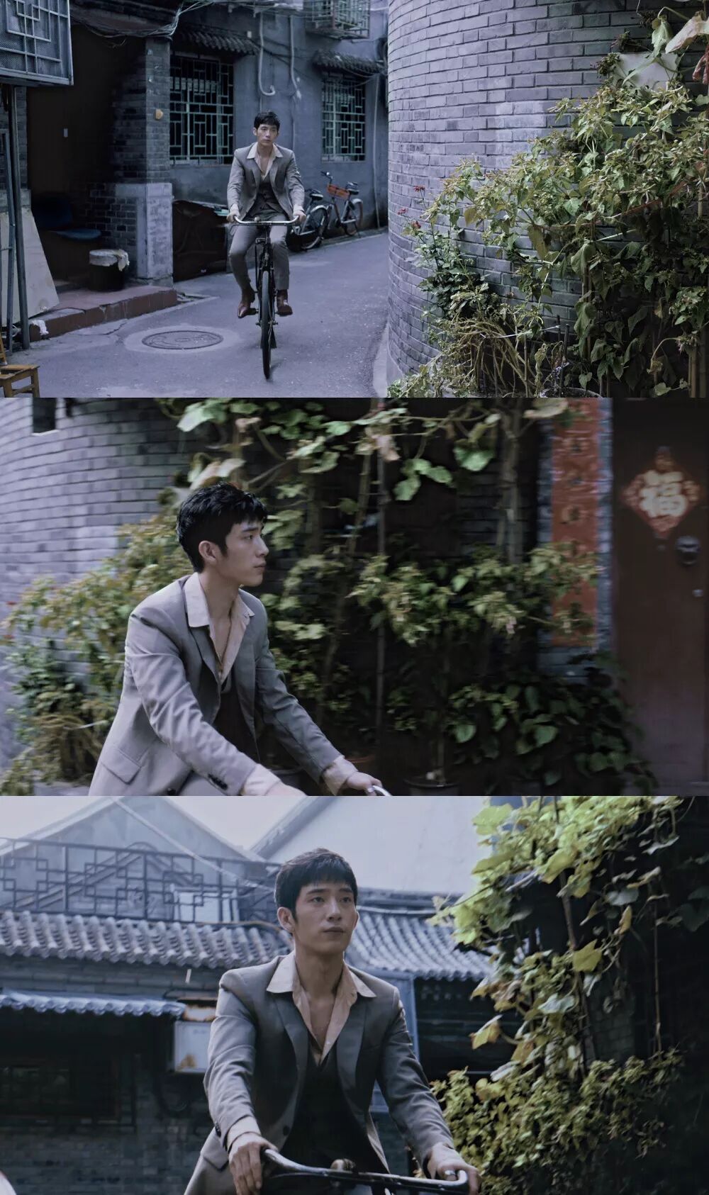 灰墙砖瓦,复古西装,单车穿行,小井先生眼神灵动,尽情感受时光的魅力。