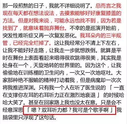比嗓音沙哑声带出血更严重的,是她左耳完全失聪,这对于一个靠唱歌而生的人是一个致命的打击。
