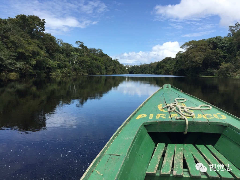 第三站,亚马逊雨林。“黑河倒灌进上游的支流,覆盖了大部分陆地,把密林顶端变成一座座浮岛。黑色的河水其实十分迷人,特别是不起风的时候,平静又深沉,像一面铅做的黑镜把世界映射在水平面的两端。”