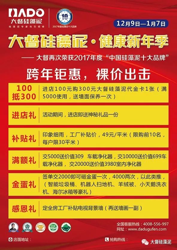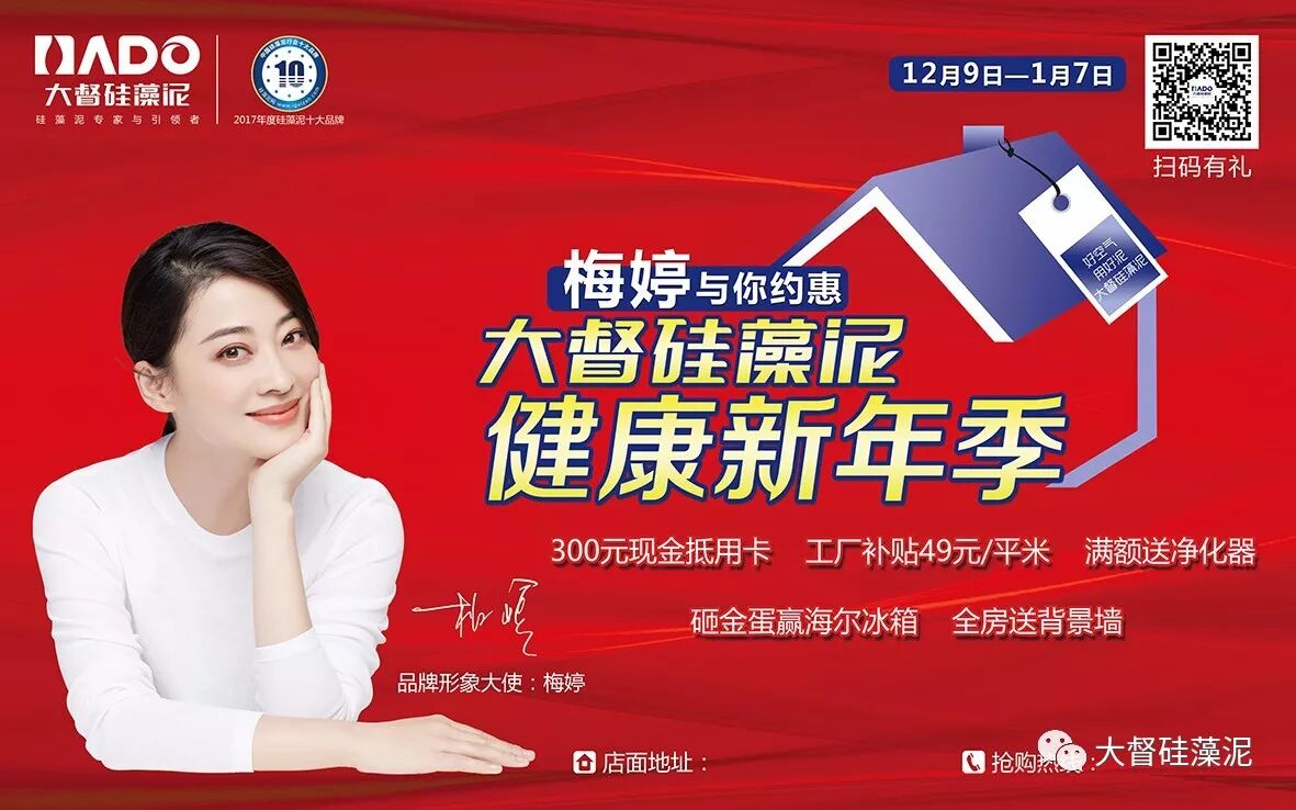 12月9日—1月7日,大督硅藻泥健康新年季,即将在全国掀起一轮健康家装热潮, 全国大督硅藻泥260余家专卖店同步启动,初步分为三大战区,京津冀战区、广东战区、苏皖战区,三大战区所有市场一线人员全力配合,以身作则,拼命完成,以大督“激情昂扬,奋勇争先”的工作精神克服一切困难。携手全新品牌形象大使梅婷、天然弱碱产品、5金施工服务、工厂级特惠力度,为全国家装业主打造一场精彩纷呈的硅藻泥新年季钜惠盛宴。