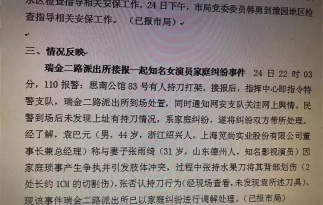 前天,张雨绮丈夫袁巴元,向派出所报案称张“持刀伤人”。