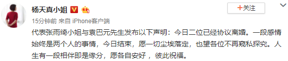 而就在大家还在争论不休的时候,昨天,仅仅一天时间,张雨绮通过经纪人杨天真微博发声: