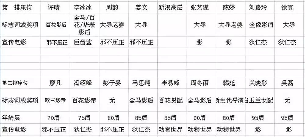 第二排的位置呢,除了廖凡和冯绍峰是70后,其他的都是80、90后新生代演员和导演。