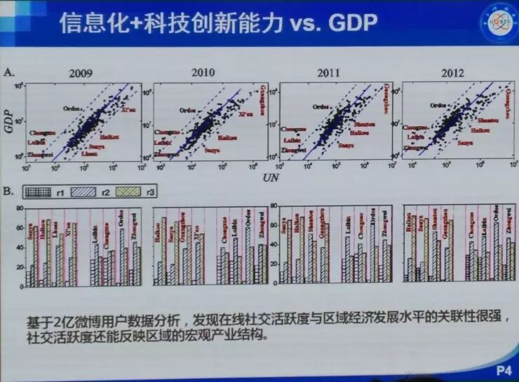 我们怎么去看这样一个问题呢?我们分析了两个很简单的量。第一个是信息化程度,数据就是这个城市有多少上网的IP(例如当年新浪微博、贴吧等)。另一个就是这个城市申请了多少市场占有权(文章、专利等),依此来看它的科技创新能力。