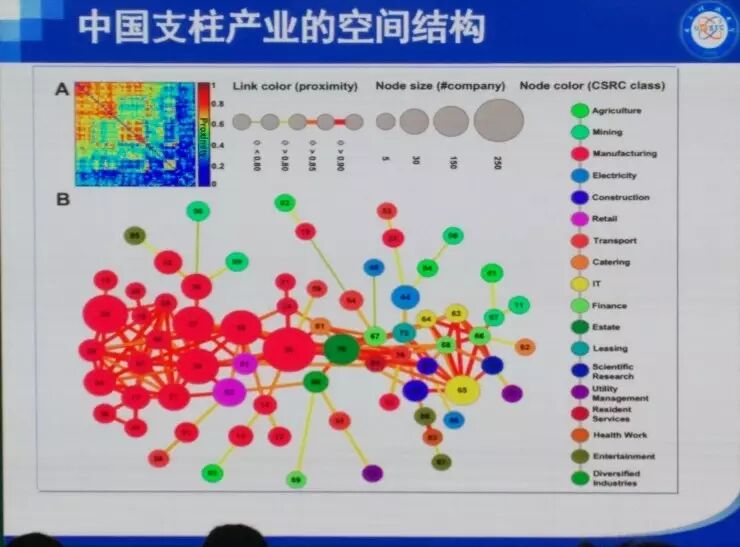 我们通过构建这样的图,来看哪些产业之间的关系较为相近。(当然评价两个产业相近有很多办法,cos值只是其中一种)我们知道,如果两个产业相近,那么它们很有可能会有共同的经济元素(人、资源、物流、仓储等),在发展过程中可能会有协同作用。这个图很明显是一个中心密集型结构。