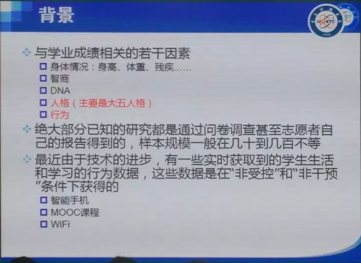 对学业有较大影响的因素有很多,例如身体状况、智商、DNA、人格、行为等。我们主要关注人格和行为,因为它们是可以干预和调整的。以前我们对这些问题的研究只能是通过调查问卷的形式获得几十、几百的样本。现在由于技术进步,我们能够获得海量的数据,例如通过智能手机、mooc或者wifi等。