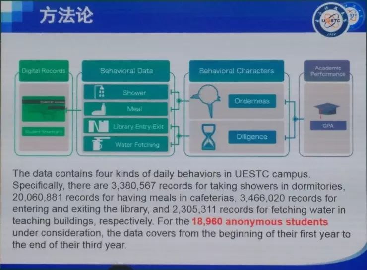 我们用的是学生校园卡使用情况的数据,我们根据这些数据能够知道学生在学校里打水、吃饭、洗澡(时间)、去图书馆、借书等等的情况。我们用了18960个匿名学生的大概3000万个记录数据。