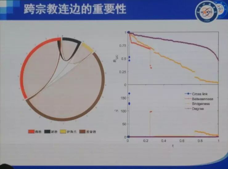 还有一个非常有意思的信息是,假设计算机是不知道连接之间是否是不同宗教,然后通过逐步去掉这些边来研究它们的重要性。我们发现如果按照“度”的方式来去掉这些边(事实上就是去掉宗教内部的连接),网络是没有相变的;而如果按照“bridgeness”的大小(bridgeness的大小表明了沟通不同区域之间的能力)逐渐去掉这些边,那么在不同的时候会出现两次相变;当按照“betweenness”的大小(简单说,这个指标衡量了一个节点作为媒介的能力,也就是占据在其他两个节点最短路径上最重要的节点,如果它拒绝沟通信息,那这两个节点就无法沟通,占据这样的位置越多,它的中介性就越大)依次去掉这些边,那么整个网络很快就崩溃了。同样,如果按“cross link”的大小(连接不同区域的能力)来依次去掉边,网络立马就崩溃。