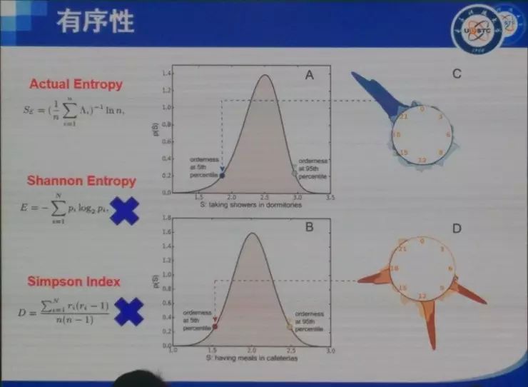 一个就是orderness,看你的生活是否有规律。我们用真实熵来衡量orderness。A图是18960名学生洗澡(时间)的数据。我们看到orderness排名前5%的学生(深蓝色),生活非常规律,基本上只在晚上9点洗澡;而后5%的学生(浅蓝色),则除了0-6点(澡堂不开门)外一天当中任何时候都可能去洗澡。B图中是吃饭情况,前5%(棕色)基本上都在三个饭点吃饭,而后5%(橘黄色)则基本上一天当中任何时候都可能去食堂刷卡,生活明显没有任何规律。