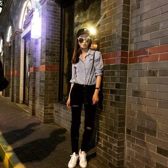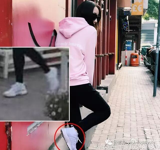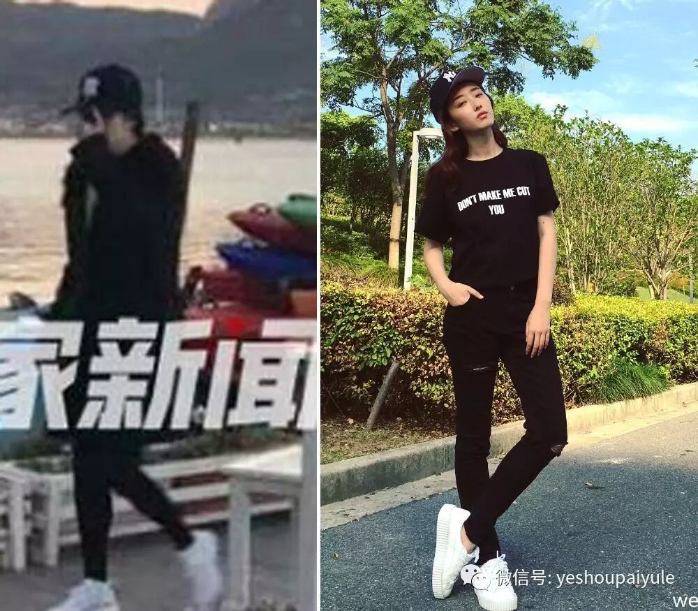 另外,蒋梦婕九月份也有过黑帽子+黑上衣+黑裤子+白鞋的造型,和那一位丽江女孩的品味如出一辙哦(下图鞋子不同款)