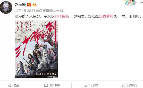 今年12月1日,赵丽颖微博神助攻:“林更新,少喝点,对蒋梦婕好一点。”