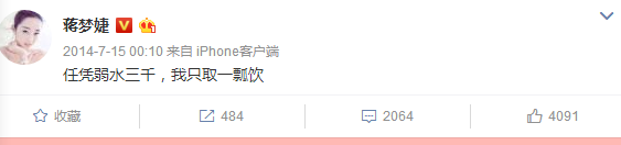 2014年7月15日凌晨,蒋梦婕发微博称“任凭弱水三千,我只取一瓢饮”,疑回应此事。