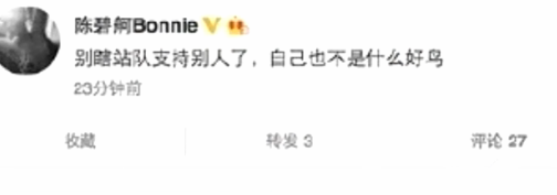 随后,陈碧舸发微博暗讽:“别瞎站队支持别人了,自己也不是什么好鸟。”