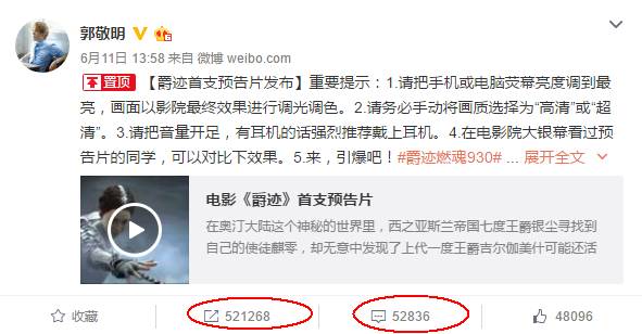 预告片发布后,郭敬明的这篇微博已经有 5万 评论,52万 的转发。