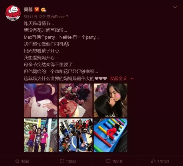 近日,吴尊在微博发文,透露自己在13日的母亲节当天和老婆忙着接送孩子去参加活动,开心当子女的司机,并甜蜜告白老婆:“妈妈想看孩子开心,我想看妈妈开心,母亲节突然变得不重要了,但他俩给的一个吻和花已经足够幸福,这就是为什么世界的妈妈是最伟大的。”