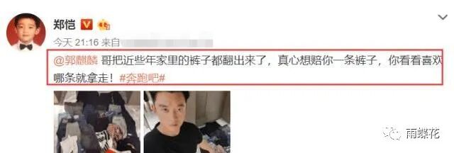 29号晚上郑恺上线更新动态,隔空喊话郭麒麟,说要赔给他一条裤子。在录制跑男的时候,郑恺和郭麒麟相处融洽也玩得开,两个人能这样喊话也是非常好笑了。而且为了表达自己的诚意,让郭麒麟挑到喜欢的裤子,郑恺干脆把家里压箱底的裤子都拿出来了,一眼看过去铺满地面。