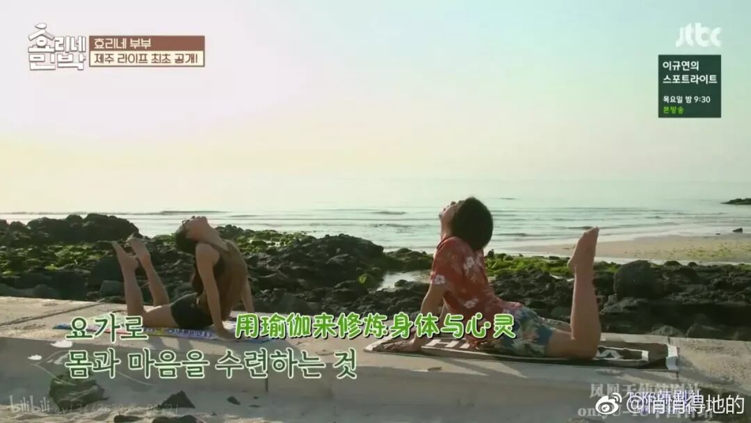 济州岛四面环海,孝利夫妇常常到海边遛狗。然后……顺便做个双人瑜伽▼