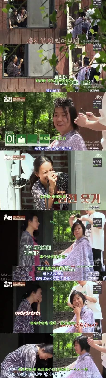 尚顺的幽默孝利也秒懂。房客给尚顺剪头发,孝利从窗户里钻出来给他拍照,他笑说自己像伊斯兰王,她笑弯了腰▼