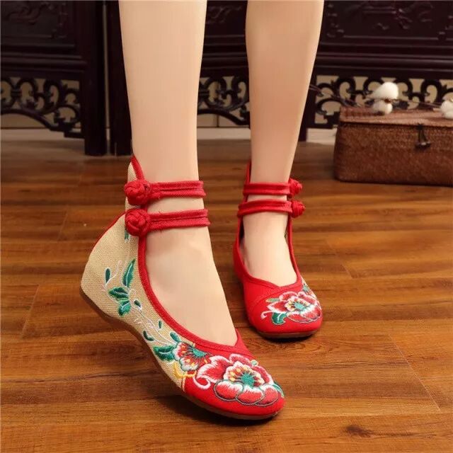 牛筋底民族风刺绣单鞋复古优雅,双层盘扣系带甜美优雅