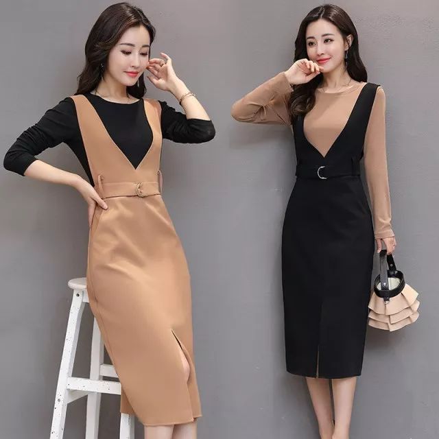 纯色打底外搭V领背带裙减龄清新,中间分叉让性感腿部线条若影若现