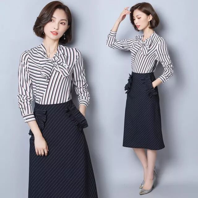 错落有致的条纹衬衫搭配半裙端庄得体,系带领口甜美淑女