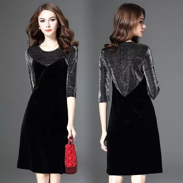 丝绒拼接假两件连衣裙娇俏甜美,A字版型修饰姣好身材