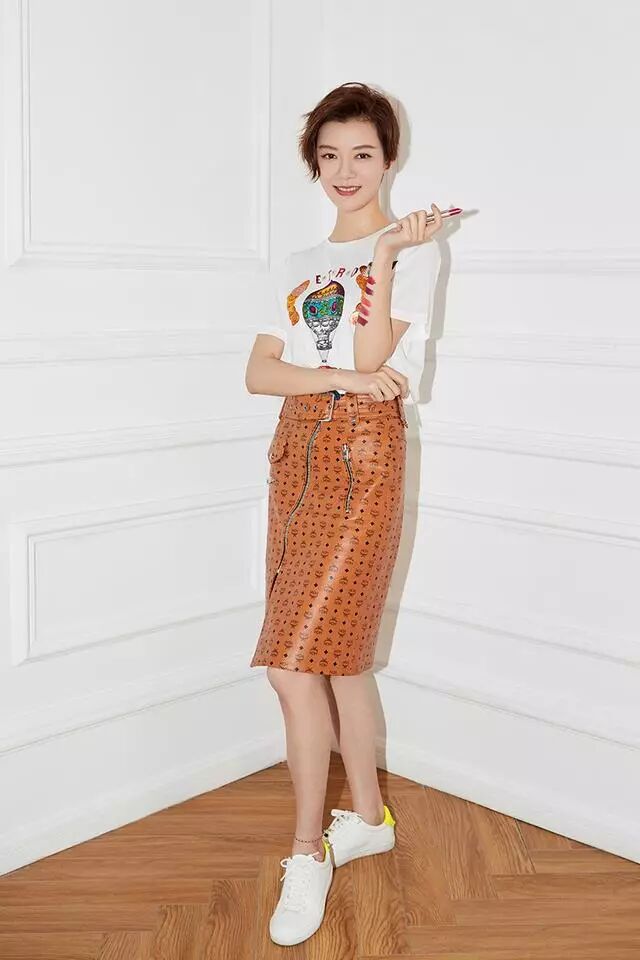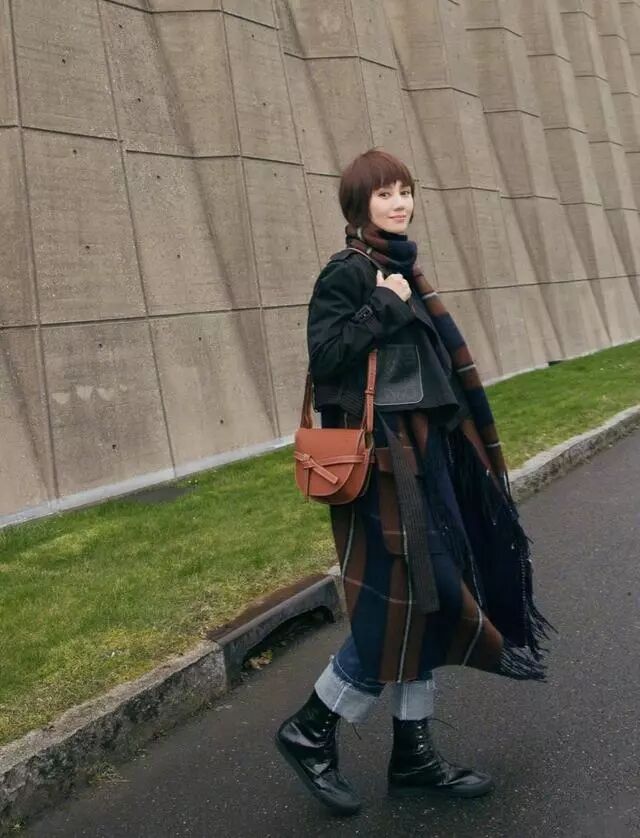即使是全身照,袁泉这小鹿般活泼的眼神也让人一眼找到焦点。硬朗风格的马丁靴也被柔和地平衡掉,让人充满了保护欲。