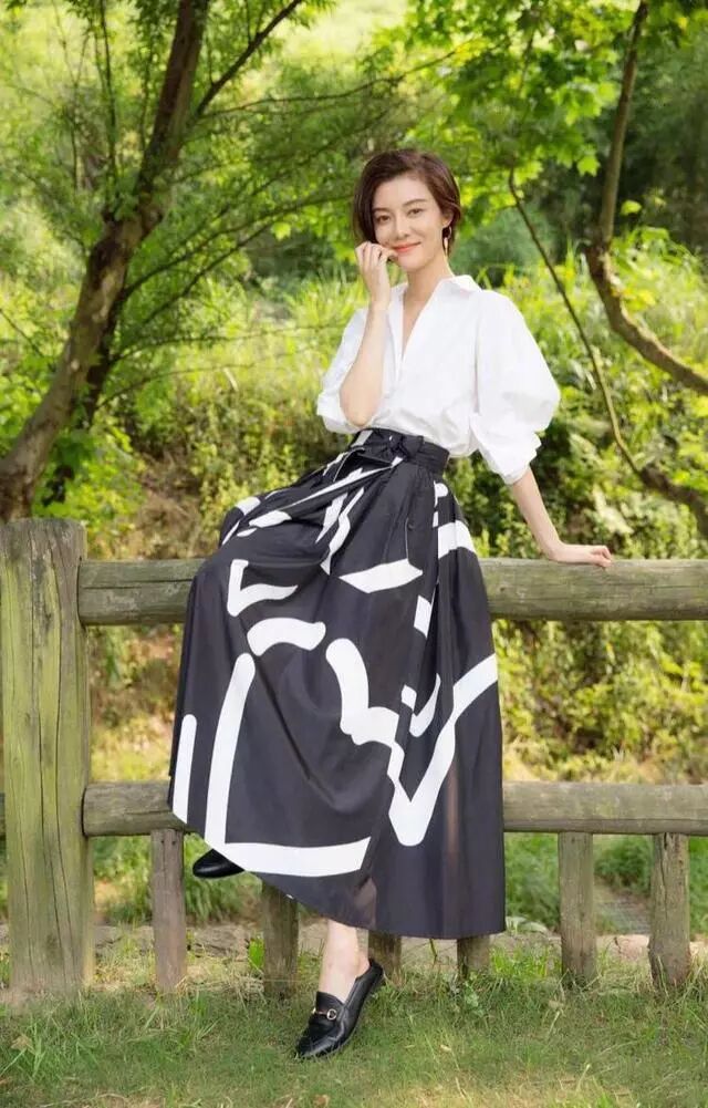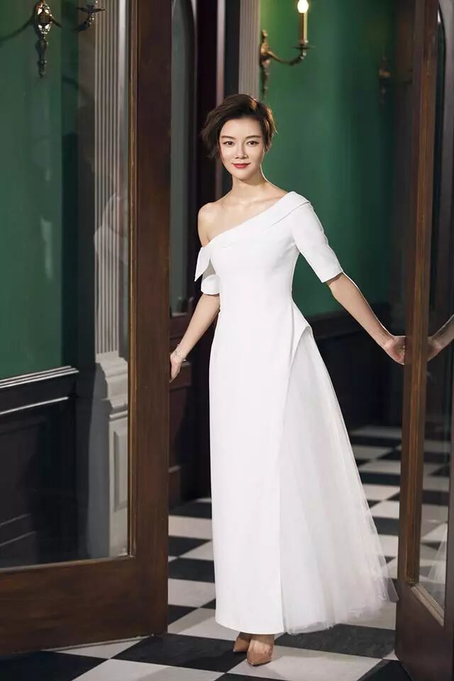 这一套斜肩白裙则是完全将车晓的女神气质衬托出来!整套Look温婉清新,纱质裙摆增加整体的柔美感,轻盈灵动,美极了!