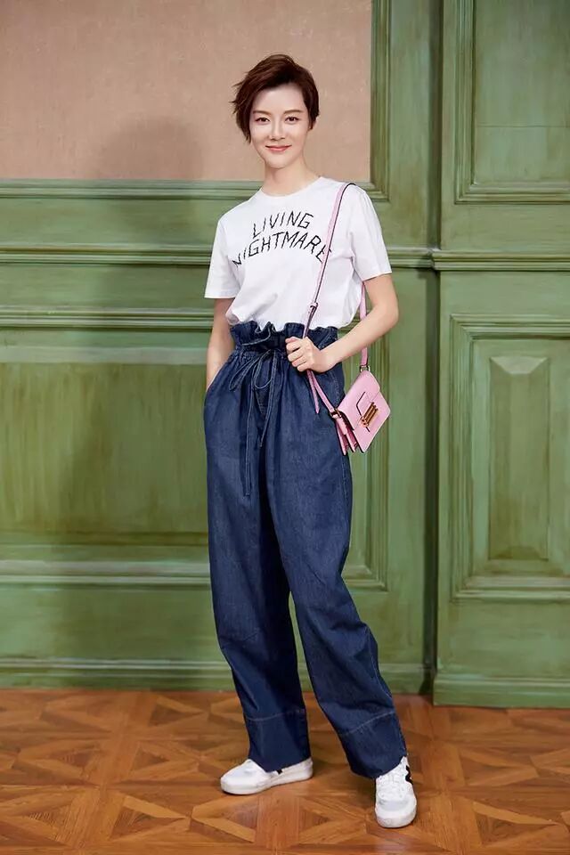 牛仔高腰阔腿裤帅气随性,Slogan Tee态度十足,车晓告诉我们高级脸不仅能走仙女风还可以做一个Cool Girl!