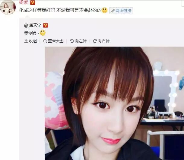 经过小编的调查发现,杨紫在马天宇发微博之后,很快就转发了这条微博,并说:“化成这样等我好吗?不然我可是不会赴约的。”还放了一张马天宇化了浓妆的照片,看起来好喜庆呀!哈哈哈,杨紫你好皮呀,皮这一下开心吗?