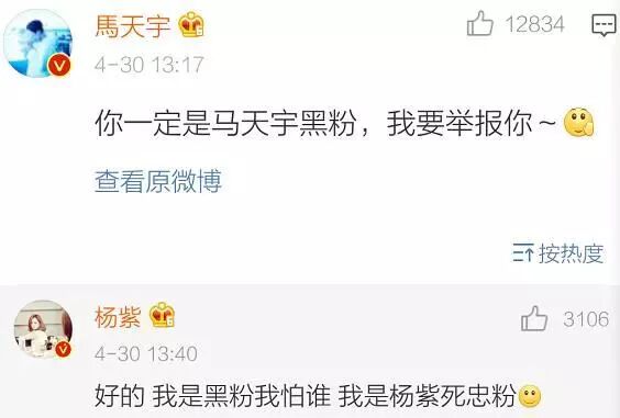 杨紫这一转发,我才知道马天宇的照片中这个女孩是杨紫啊,虚惊一场!但是看起来真的不像杨紫呀,你们看出来了吗?马天宇和杨紫关系甚好,两人在评论区里“互怼”。马天宇:你一定是马天宇黑粉,我要举报你~杨紫回:好的,我是黑粉我怕谁?我是杨紫死忠粉。看起来虽然是像是互黑,但是实际上两人感情很好。