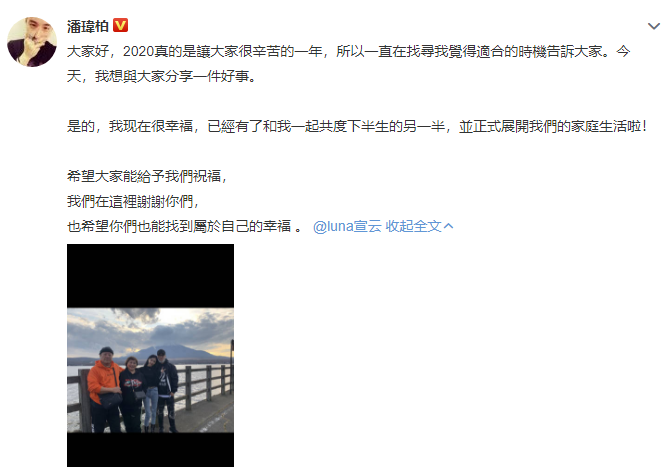 2020年7月潘玮柏突然在微博晒出一张全家福,官宣自己与空姐宣云结婚的消息。