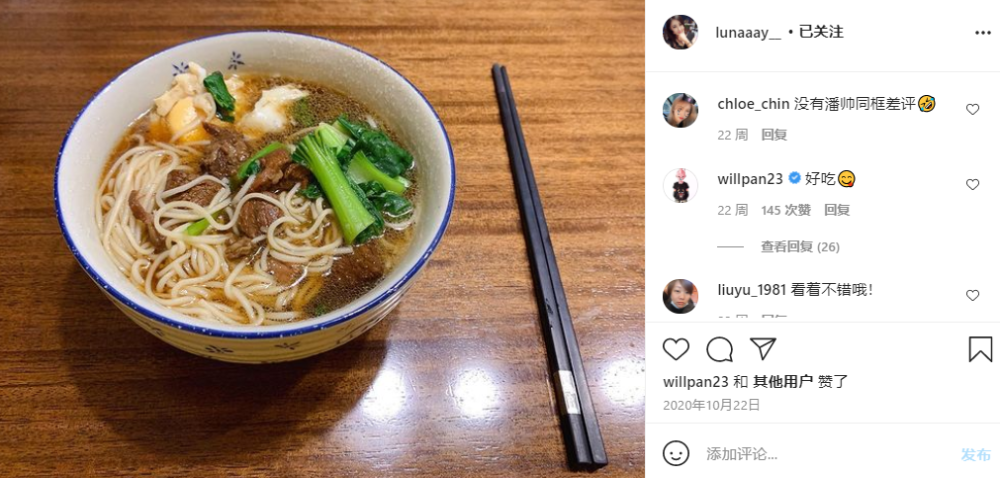 从去年10月份开始,潘玮柏就频繁在社交媒体上与妻子互动,还幸福表示与她一起吃的牛肉面味道很好。