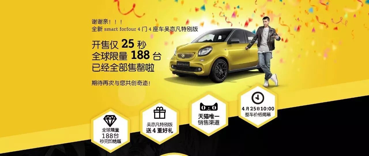 与其硬朗形象契合的手游《全民突击》、全球第一彩妆品牌美宝莲、潮流风向标YOHO! 、戴尔xps旗舰机型、雷朋眼镜,这一系列品牌都纷纷锁定吴亦凡,希望借由他的高端形象让自己的产品更有分量;Smart奔驰更是任吴亦凡为首位华人品牌大使,同时定制吴亦凡特别版,在天猫限量发售,并创下25秒售空188台售价175,888元奔驰Smart的传奇纪录,这些数据无一不展现着吴亦凡本身的高端影响力和价值。